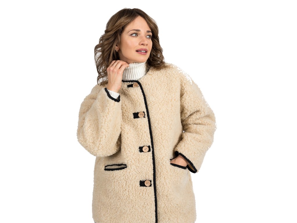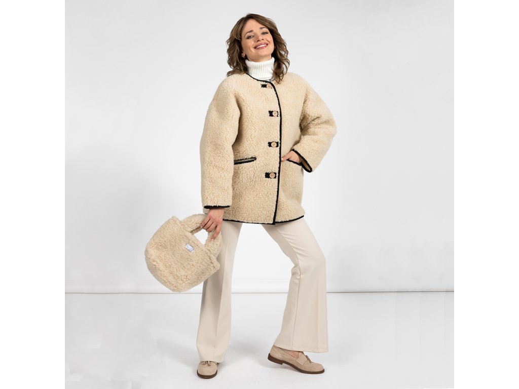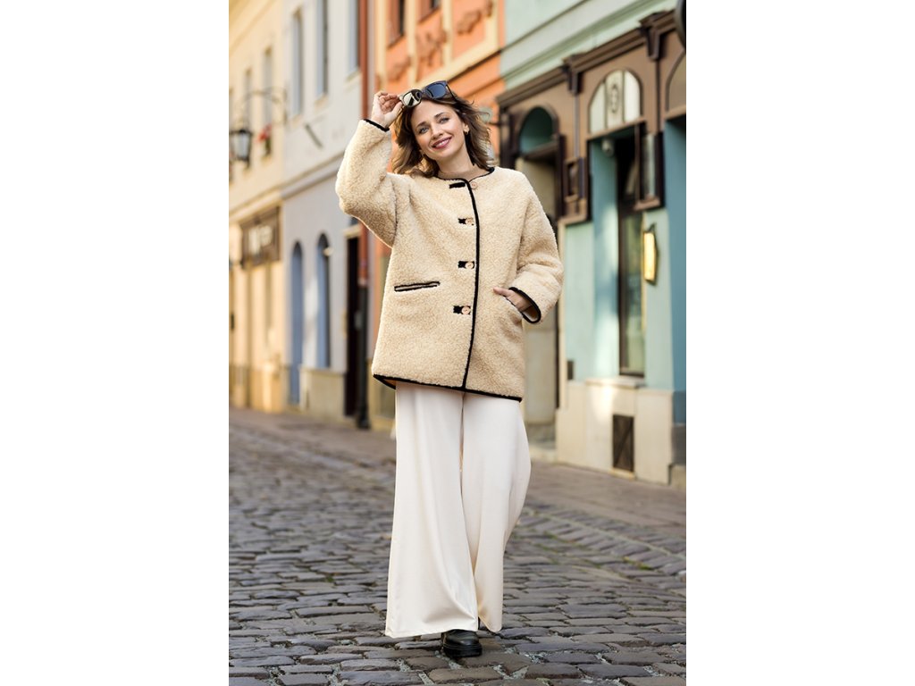 Dámský vlněný kabátek ELEGANT v moderním střihu v béžové barvě. Díky vlně je kabátek velmi elegantní, lehounký a přitom má velmi dobré tepelné vlastnosti. Zapínání kabátu je na knoflíky a po stranách má 2 kapsy.