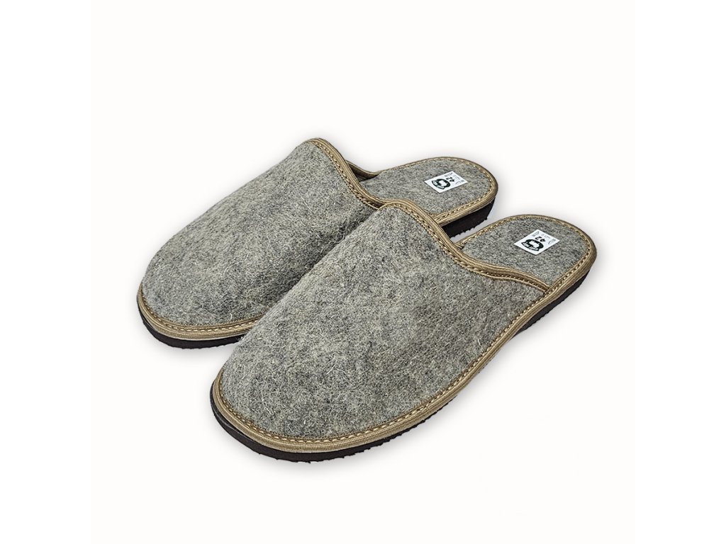 Pantofle filcové s uzavřenou špicí pánské. Svršek tvoří filc vyrobený ze 100% ovčí vlny. Podrážka je pryžová tlumící s ortopedickým klenutím.