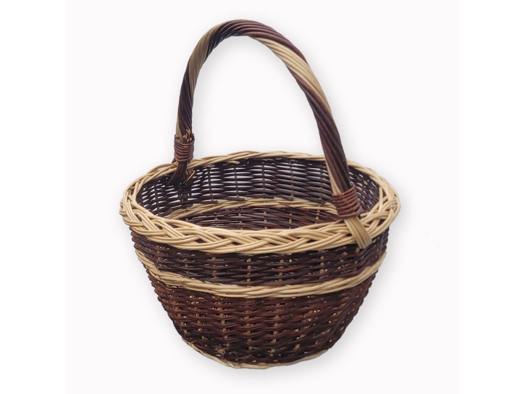 Košík oválný z neloupaného vrbového proutí dvoubarevný s dlouhým uchem vhodný na zeleninu, ovoce, nákupy nebo například i na polínka. Košík vyniká velmi pevnou rukojetí a kvalitním vypletením z neloupaného proutí, drží perfektně tvar a zelenina, ovoce nebo potraviny zůstávají nezdeformované a nepomačkané.