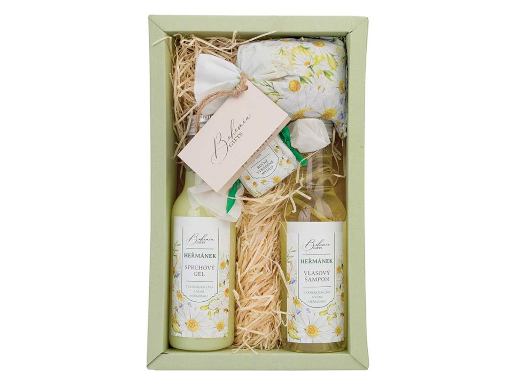Dárkové balení kosmetiky s extrakty heřmánku a lnu. Vám udělá z každé koupele návštěvu lázní. Krásná vůně heřmánku excelentně vyvážená kvalitními oleji, vytvoří tu pravou atmosféru pro relaxaci.