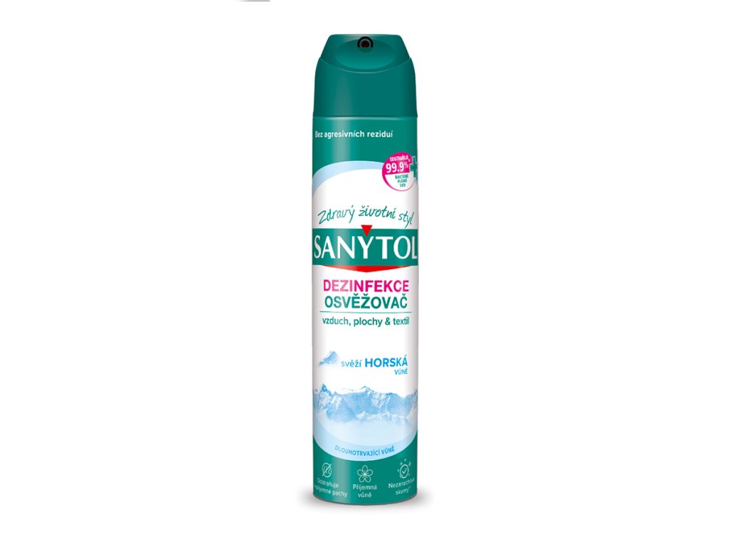 SANYTOL vyčistí vzduch a vydezinfikuje povrchy v jednom jediném kroku. Jeho složení zajišťuje dokonalou hygienu a zanechává příjemně svěží vůni hor. Zahubí 99,9 % bakterií, plísní a virů, včetně viru chřipky typu A (H1N1). Dezinfikuje, čistí, absorbuje a ničí pachy tím, že odstraňuje jejich příčinu (mikroby). Působí na vzduch, povrchy a bytové textilie. Nezanechává skvrny, k textiliím je šetrný.